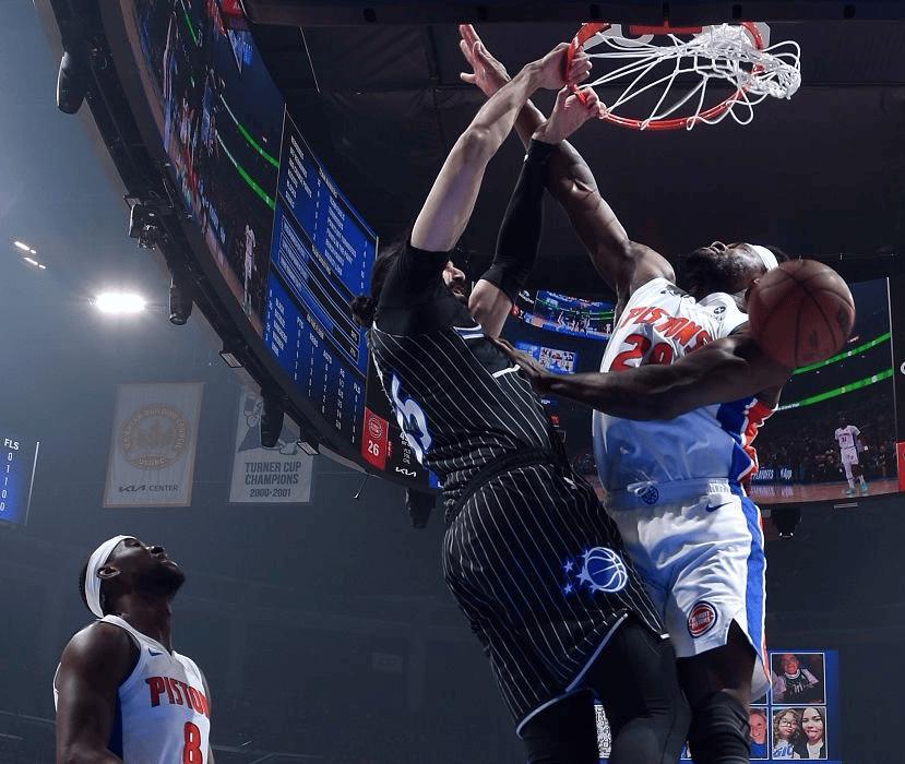 活塞也在节末把劣势追回,第一节比赛结束,两队战成26-26平。次节比赛开始,赫尔特垫步起飞上篮稳稳命中,帮助活塞先下一城,小瓦格纳幽灵漫步冲击篮下挑落两分予以还击,詹金斯弧顶大号三分张手就有,哈里斯高难度的拉杆上篮,打进还有加罚,贝恩三分线外火速跳投继续命中,哈里斯起飞之后的单臂划扣技惊四座。两队第二节进攻效率都保持得不错,不过仍然是主场作战的魔术更胜一筹,贝恩手感火热,连续飙进三分球,瓦格纳和萨格斯也强硬冲击活塞禁区连连得手,魔术单节轰出35分,半场比赛战罢,魔术61-54领先活塞队7分。