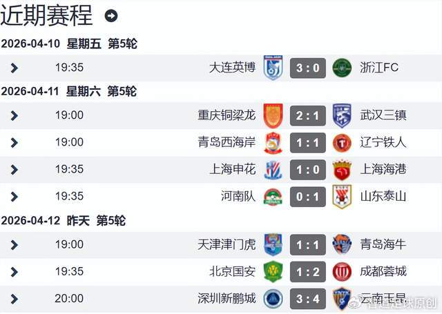 中超第5轮的8场比赛已经全部战罢,具体战况如下:大连英博3-0浙江、重庆铜梁龙2-1武汉三镇、青岛西海岸1-1辽宁铁人、上海申花1-0上海海港、河南0-1山东泰山、天津津门虎1-1青岛海牛、北京国安1-2成都蓉城、深圳新鹏城3-4云南玉昆
