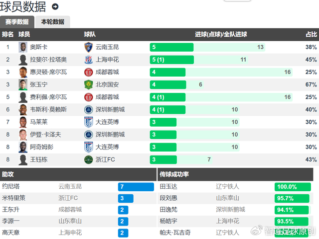 在中超射手榜上,奥斯卡和拉唐5球并列第一,4人4球并列第三;在中超助攻榜上,约尼查7助遥遥领先,米特里策3助排名第二。